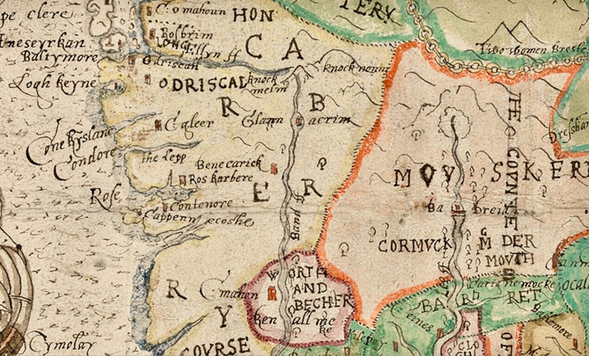 This is a ‘ground entry’ castle – they were built later than the ‘raised entry’ castles of the O’Mahonys and are consequently more designed for comfort (fireplaces!) and more likely to be inland rather than coastal. This one was a castle of the Hurley (Ó Muirthile) clan, although it may also have been built (or acquired, or relinquished) by the McCarthys. The Hurleys managed to hang on to it until the mid-1600s when it was seized by forfeiture and handed over to the Crofts. The castle shows up in Jobson’s Map of Munster, completed around 1584, noted as Benecarick Castle – can you see it? It’s right where it should be, but don’t forget that this map has south on the left and north on the right.