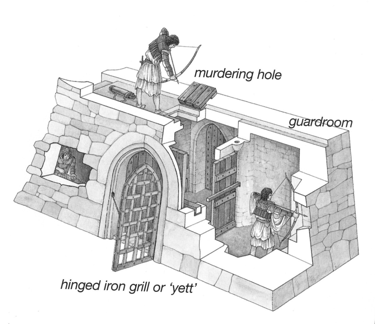 This feature was known as a yett. The chain that pulled it closed was managed by a sentry in a small sentry room to the left of the doorway. There is no sign of a murder hole above the entry lobby, as there is, for example, at Kilcrea.