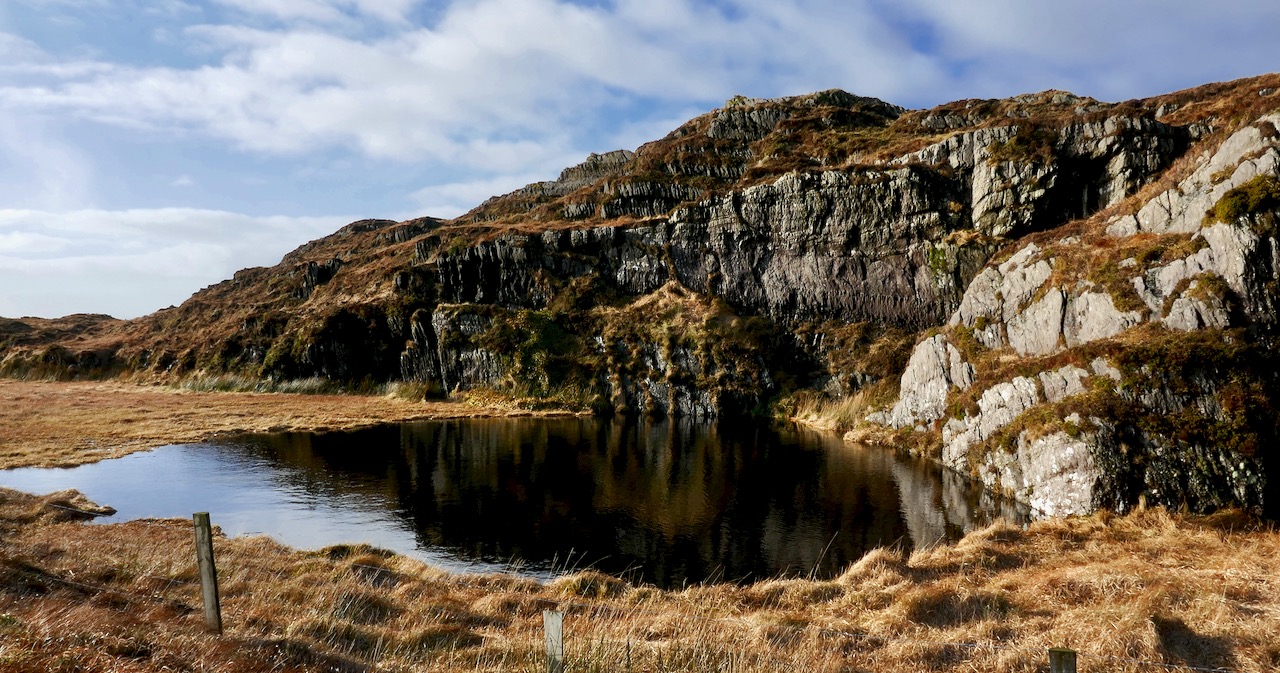 I think this impression is my fault – the photograph below does seem to emphasise a ‘marshy area’ with a puddle. In reality the lake seems to be more or less the same size in the earlier OS maps (dating to the 1840s) as it is now, and that photograph was taken in such a way as to hide most of the lake. I think I was just trying to show the location in relation to the sea and the islands in the distance.