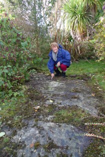 These petroglyphs are certainly enigmatic. Mainly, they are ‘cup marks’ (circular depressions in the rock) often, but not always, surrounded by a ring or rings – although various other shapes have also been found. It’s amazing that they continue to survive as most are on exposed sites, constantly battered by the West Cork weather – but they do. Yesterday we went to have a look at a recently discovered piece, near Schull. It is in the garden of a private house and is almost completely hidden by encroaching moss and undergrowth. With permission we pulled back some of the moss and had an initial look: it’s a good example, with deeply incised cup and ring marks. Finola found in her researches that Rock Art sites often have views of the sea and of mountains – as does this one in the Schull garden (and those at Ballybane West). It is, therefore, possible that they have a geographical purpose; there is no way of knowing, unless we are ever fortunate enough to slip through a time warp and meet up with one of the original artists (who speaks English). I am always hopeful of this, and will let you know – somehow – if it happens….