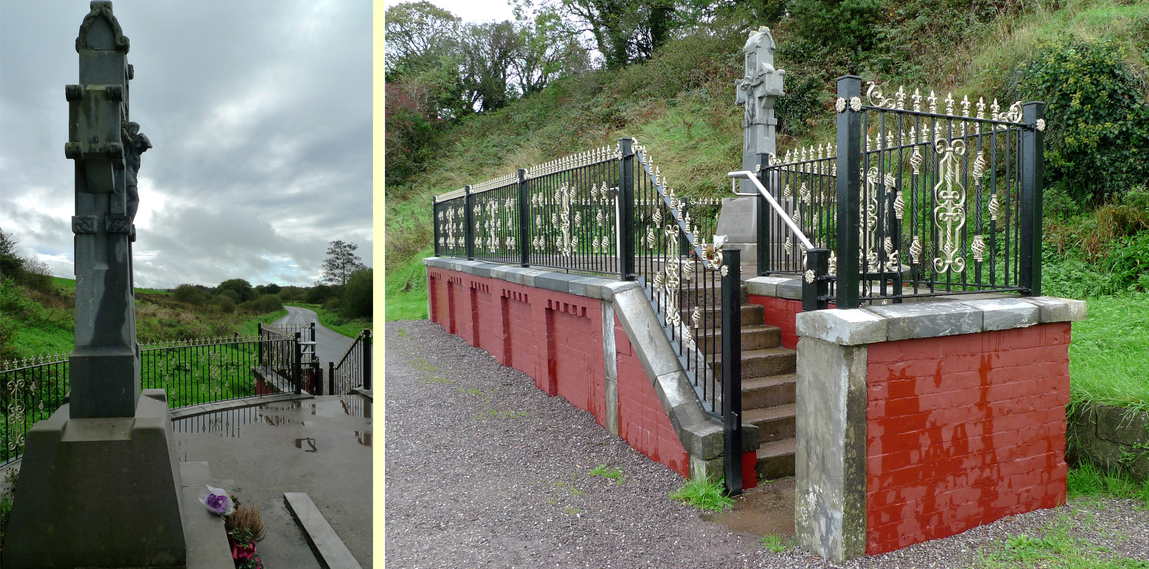 Béal na Bláth may mean ‘Gap of the Blossoms’ but there is some debate as to its correct translation: ‘Mouth of the Ford of the Buttermilk’ is one suggestion. Brendan Behan, in his folk ballad on the death of Michael Collins (the first stanza of which starts off this post), goes for ‘Mouth of Flowers’. We began our pilgrimage here on a wet Sunday morning. The place had a sombre atmosphere and the monument that we found – although unmistakably Messianic – is grim. Crowds come to this site, especially on the anniversary of the assassination. A white stone marks the actual spot where he fell: the fine details seem all important.