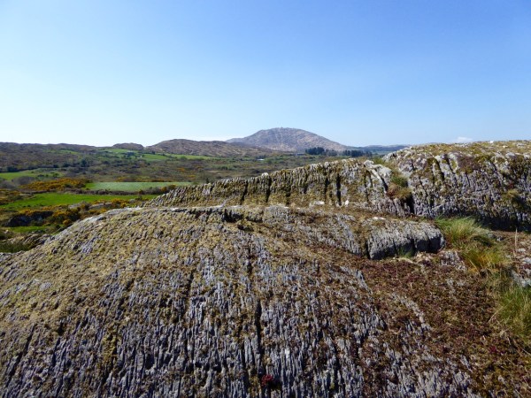 Rathruane More: the view from the rock art site includes a knoll with a row of cupmarks on its upper surface, and Mount Gabriel on the horizon