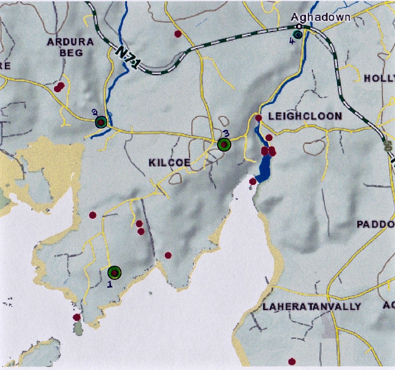 The four churches: 1, Kilcoe Medieval Church. 2, Mass Rock. 3, Kilcoe 19th Century Church. 4. Kilcoe Modern Church of the Most Holy Rosary