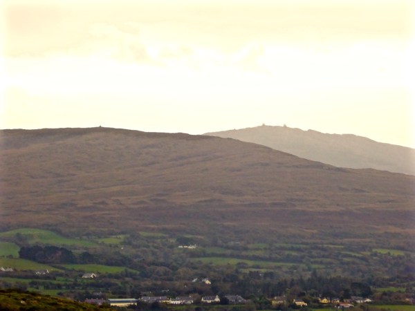 Mount Corrin cairn, with Mount Gabriel behind – both these points can be sign from many miles away