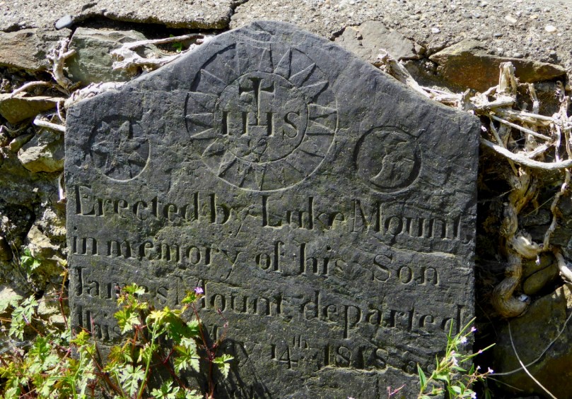 Several of the headstones feature a sunburst as well as sun, star and moon motifs. Powerful symbols of the soul and of immortality, as well as rebirth, these motifs were very popular in the eighteenth century. The IHS symbol (explained in Memento Mori) usually adorned the top of the headstone.