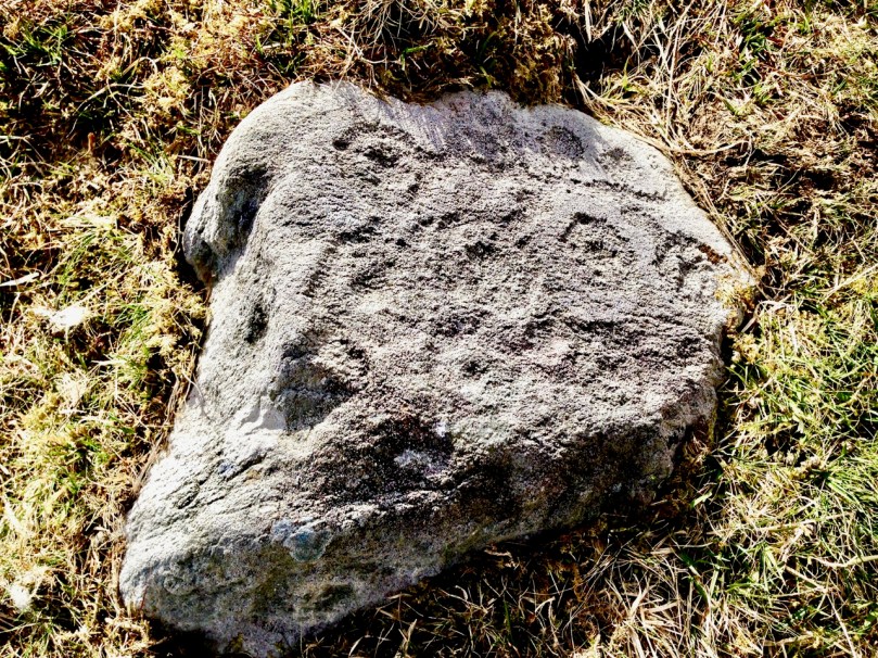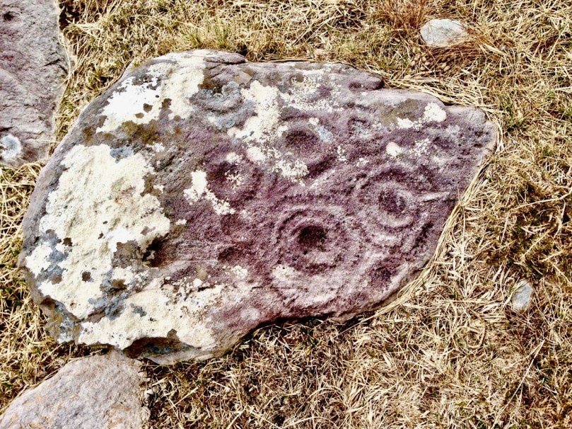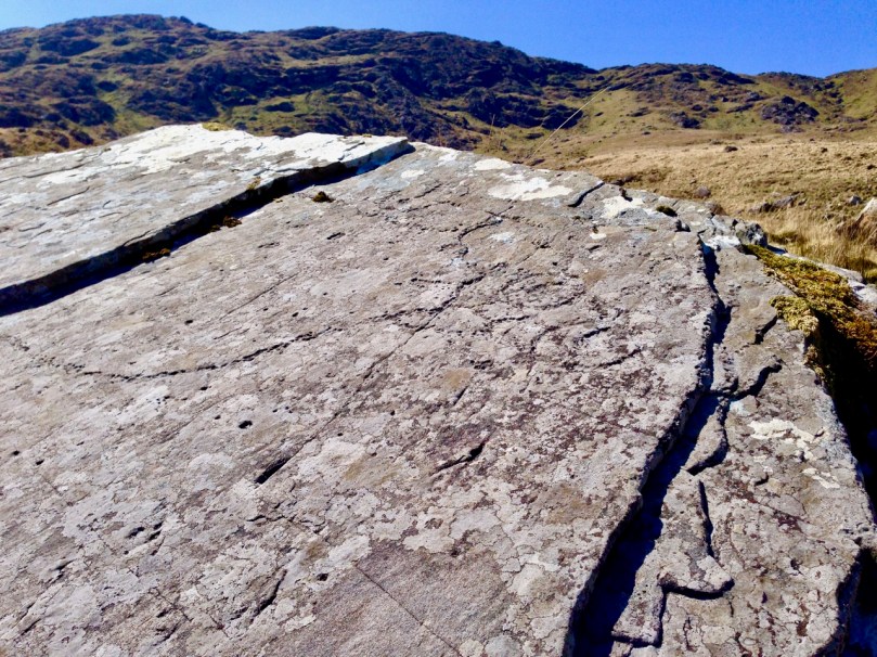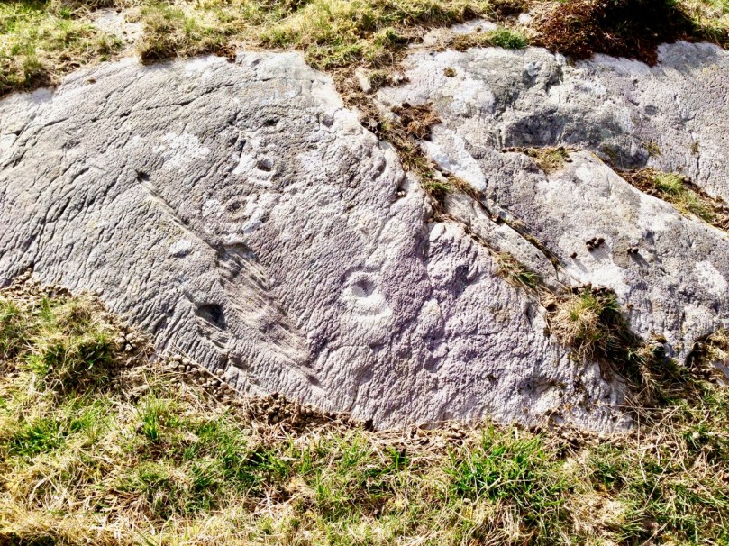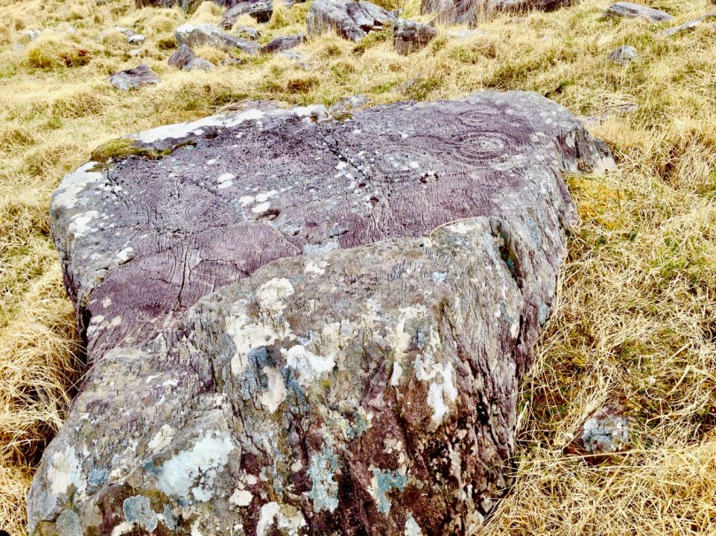 When we give talks about Rock Art we ask a question: Is it art? Some of it is certainly pleasing to the eye – the iconic Derrynablaha carvings are. But they also appear random, as though new carvings have been squeezed in amongst older ones: maybe the proliferation of motifs – or the number of carvers involved – was more important than any particular visual effect or relationship. We don’t ever try to answer that question, nor guess meanings for things we can never know. It’s enough – for me, at least – to experience these ‘footprints’ of former souls in such wild places.