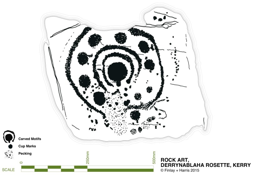 My introduction to prehistoric Irish Rock Art came in the early 1990s when I first visited West Cork to look at a piece of land which my friends Danny and Gill had purchased, with a view to building themselves a house: I was to be the designer. We walked the 5 acre site at Ballybane West and discovered a large, flat outcrop of rock some 30 metres long by 10 metres wide, the surface of which was covered with strange carved motifs. These intrigued and occupied me for many years. Eventually I made contact with the Department of Archaeology at University College Cork and unearthed Finola’s thesis. Finola had visited ‘Danny’s Rock’ during her explorations: she and I have just completed a comprehensive article on Rock Art in the environs of Ballybane West for a forthcoming edition of the Journal of Bantry Historical Society, due to be launched on 10 May.
