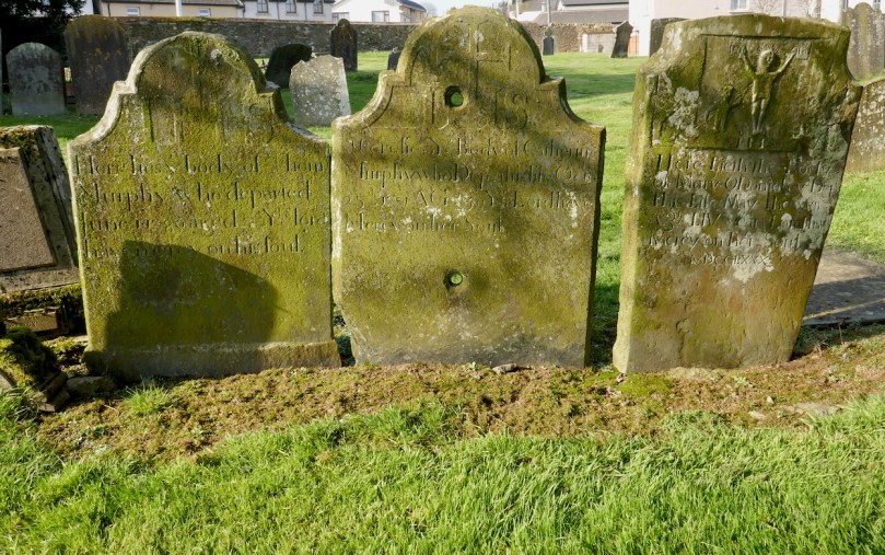 Two early headstone, from 1758 and 1773, starting with Here Lieth. Mogue is a local name, for Saint Mogue of Ferns, whose well lies across the road. Note that the final Y of Mercy doesn’t quite fit on the line so a superscript is used