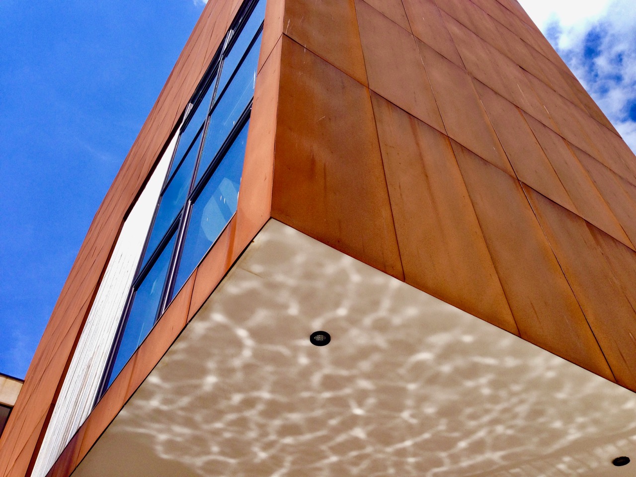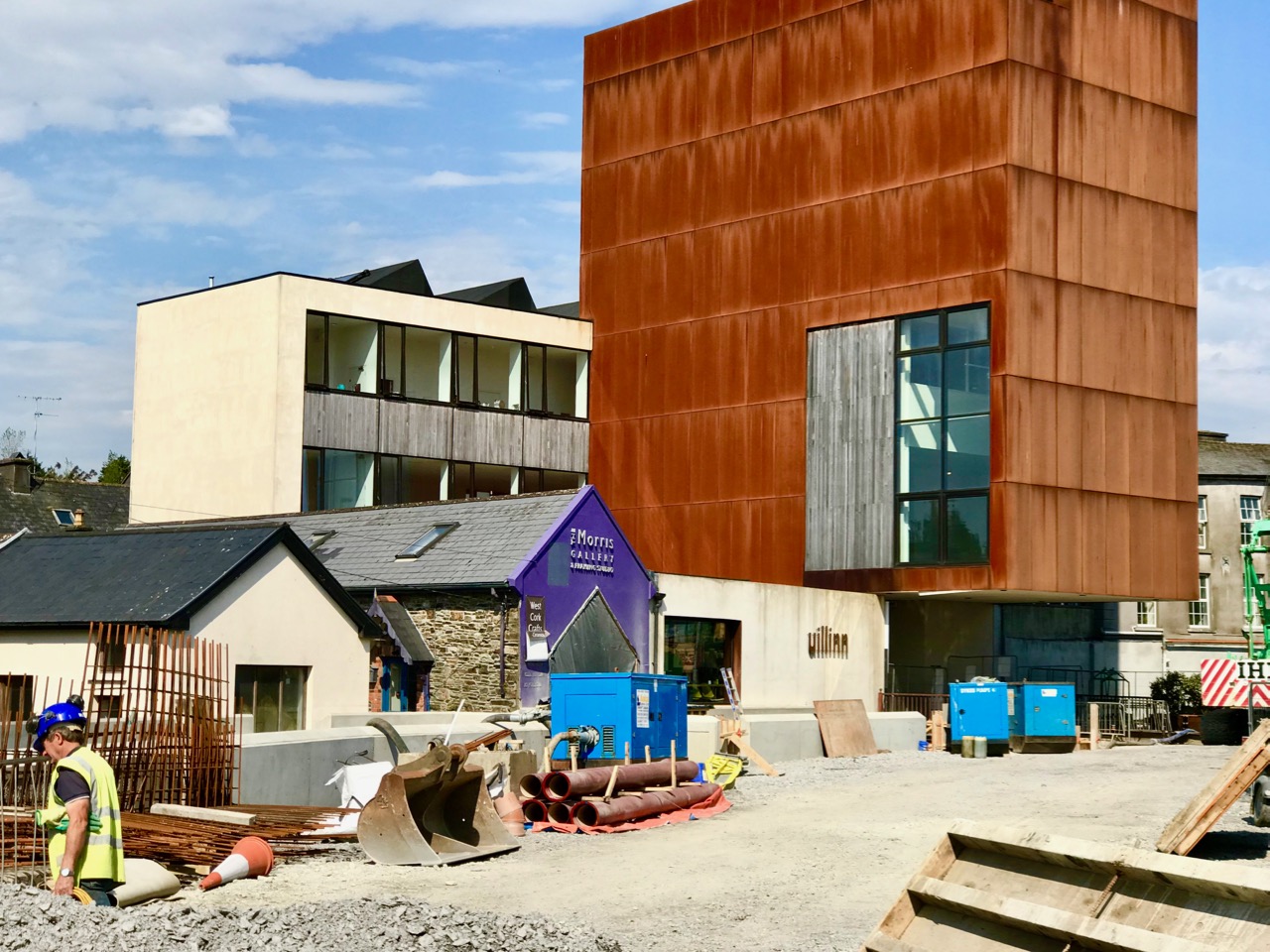 When the West Cork Arts Centre took the plunge to propose a significant arts gallery in Skibbereen back in the early years of the new Millennium, an architectural competition was held. In 2009, the winning design, by Dublin based Donaghy and Dimond Architects, proposed a dramatic 5-storey high Corten steel-clad box cantilevering over the Caol Stream that runs beside the site, gaining valuable ‘bonus’ space for accommodating the work of the Centre. In fact, the name Uillinn means ‘elbow’, and the gallery is situated on a bend – or elbow – of the stream. Economically – after the collapse of the Tiger years – it was a difficult time for Ireland and numerous projects were being cut or shelved, but work on the gallery went ahead, although not without compromise. Here’s an excellent article from the Irish Times which charts the progress of the building process.