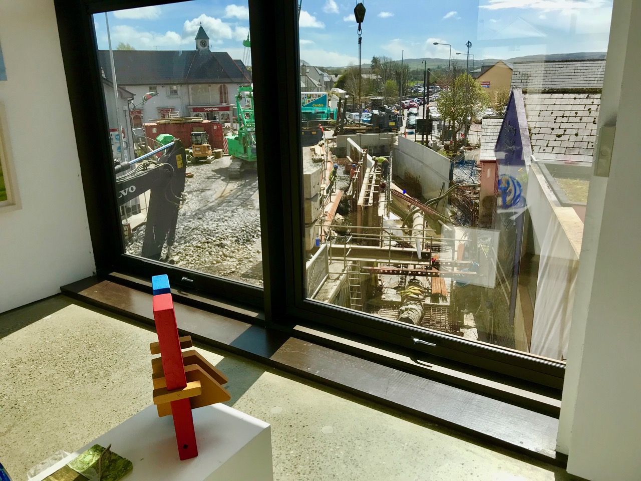In spite of all these works (which, for Skibbereen as a whole, won’t be finished until 2019) Uillinn – and the renowned Kalbo’s Café which it embraces – have to remain open and viable at all times. This is being achieved by constant liaison and close co-operation with the contractors, Jons Civil Engineering, appointed by Cork County Council, as agents of, and in partnership with the Office of Public Works. Although delayed by the ravages of Hurricane Ophelia and other severe winter storms, the contractors have pulled out all the stops in order to restore normality to the centre of the town as soon as possible and have managed to maintain full access to the gallery and cafe, and all premises in the path of the works, although some disruption to businesses in such circumstances is inevitable. On the west side of the Caol Stream, between Uillinn and Skibbereen’s Main Street, a disused single story shop has been purchased and demolished, and its site now provides a new pedestrian access to the gallery – and it’s one which will continue to be used once everything is finished and the bridge is restored. Suitably streetscaped, the overall approach to Uillinn will be much improved as a consequence of all these works.