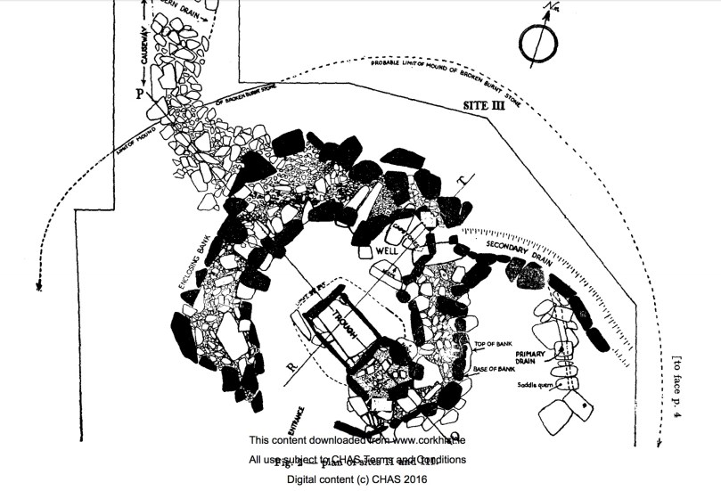 E M Fahy excavated Drombeg in 1958 and returned the next year to dig the fulacht fia. This is his site drawing of the fulacht fia. You can read his original report here.