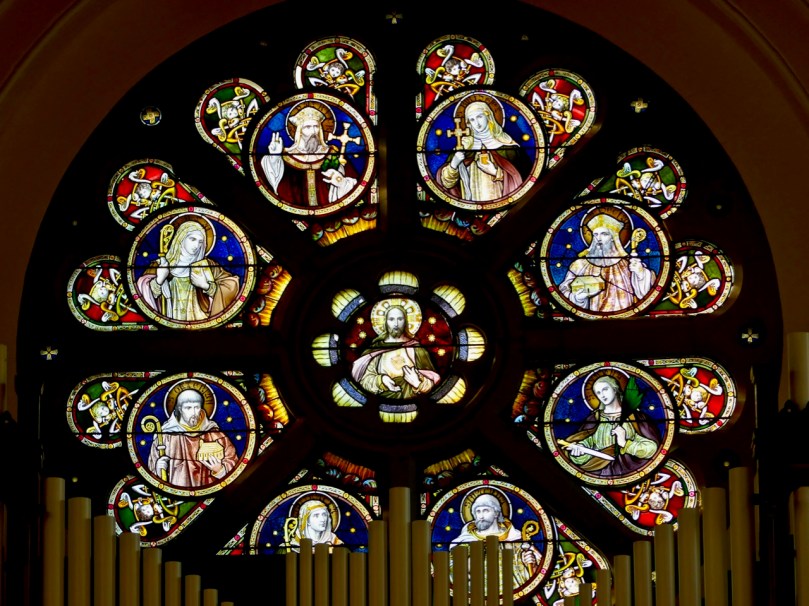 I think I’d better get on with the story. When we were in Lismore recently I visited the enormous and architecturally-interesting Catholic church called, (like the Church of Ireland Cathedral down the road) after St Carthage (AKA Mochuda or Mochua). In this church there is an impressive rose window, which I decided to feature on our Facebook page the other day. In doing so, I found I had to decipher the names of the saints, in an ancient script around their haloes. All of them were familiar to me except one – St Otteran. My quest to find out more about him led me to this story.