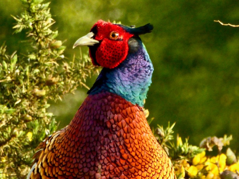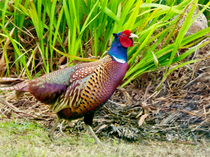 Finbarr is very beautiful. First of all, he’s a big bird, about the size of a small chicken, with sturdy legs and long tail feathers. But it’s his colouring that sets him apart. Overall, he’s a reddish brown colour, but his breast gleams copper and gold in the sun. He has a white neck ring and above it the real drama starts – his neck and the top of his head is an iridescent blue-green, but shades into purple around his cheeks. And then there are the wattles – brilliant scarlet flaps that cover each cheek and hang down either side of his face. Little blue-green crests stick up above the eyes like tiny horns.