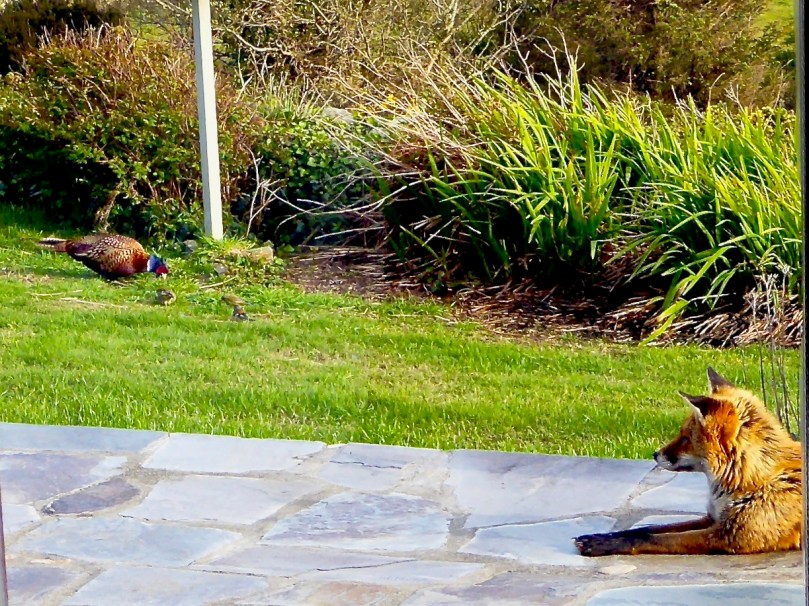 The pheasants get along with all the other birds – the small birds aren’t afraid of them, and the pheasants don’t seem to be bothered by the big black rooks that descend in flocks. I guess they are big enough not be be intimidated. And that even extended to Ferdia! Remember Ferdia, our friendly and much-loved fox? I loved that they seemed content to just hang out in the garden together.