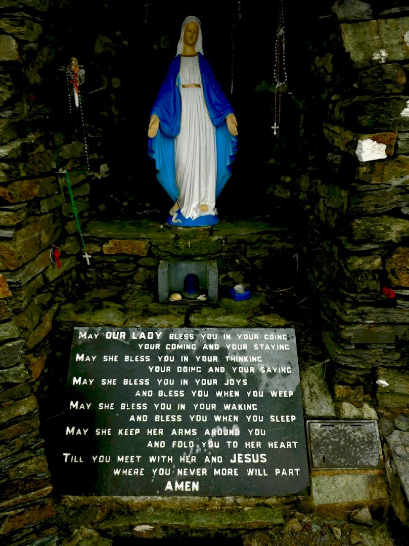 Although this was a holy well, dedicated to St John, it appears to have been repurposed as a Marian grotto, with St Bernadette in a small shelter of her own