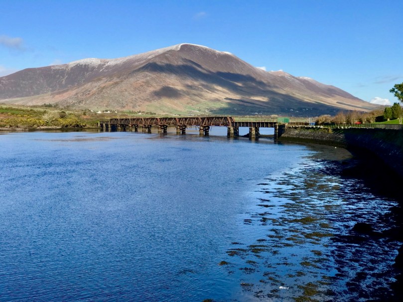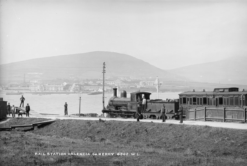 Here’s a railway map and photo dating from around 1901 showing ‘Valentia Harbour Station’. In fact, it’s not on the island at all, although Knightstown – the ‘planned village’ designed by Alexander Nimmo for the Knight of Kerry in the 1830s can be seen across the water. The station – the terminus of the most westerly railway in Europe – is on the mainland, to the east of  Valentia Island, which could be reached by a ferry. The Farranfore to Valentia Harbour Railway was 39½ miles long and operated from 1892 to 1960. The photo below shows the Valentia River Viaduct just outside Cahersiveen, now derelict but hopefully to have a new lease of life when a planned cycling greenway is developed along the old railway track.