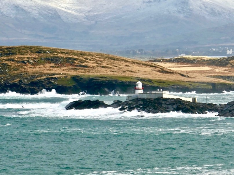 In the winter sunlight, the little village of Portmagee which stands at the threshold of Valentia Island and connects to it by a bridge opened in 1971, looks like a picture postcard. In fact, the bridge was opened twice – once on New Year’s Day, when it was blessed by the Bishop of Kerry – and again at Easter, because there was some debate about whether the first opening had been ‘official’ or not!