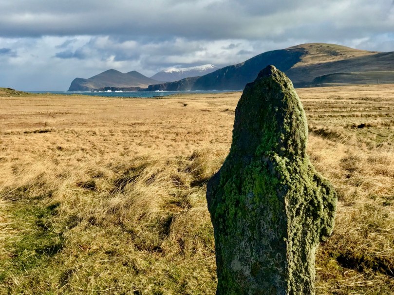 At the very end of January – when we should have been in the dark depths of winter – we headed off to Valentia Island in County Kerry, and enjoyed sublime golden sun. This time of the year often gives us the best light: we experienced this on our expedition through the Yellow Gap in West Cork a fortnight ago, and again during these three days in our neighbouring county last week. It’s to do with the low sun: somehow it enriches the amber hues of the landscapes, which are themselves enhanced by backdrops such as the one above. An ancient stone is set against a distant turquoise ocean and dark, snow-capped mountain peaks.