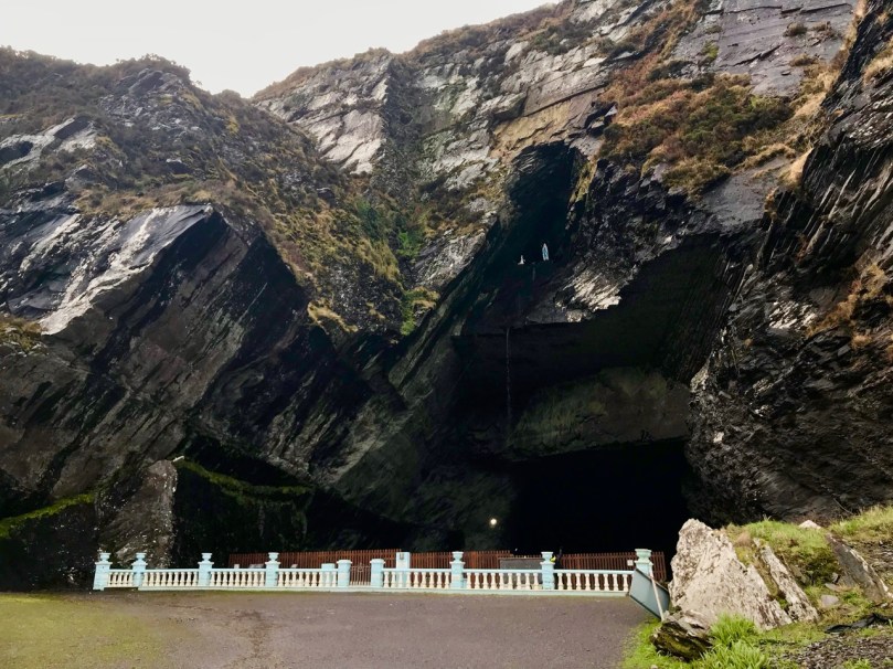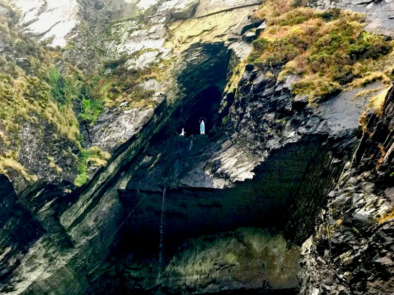 The Grotto – in this case a statue of the BVM together with Saint Marie-Bernadette Soubirous, the girl who witnessed Mary’s apparition in Lourdes – was installed in the Marian Year of 1954 in a cave high above the entrance to the Valentia Slate Quarry on Geokaun Mountain, at the north end of the Island. The Quarry had been opened in 1816 and supplied slate to the Palace of Westminster, Westminster Abbey, St Paul’s Cathedral, London railway stations and many another building project. The quarry excavated a huge cave into the mountainside, and closed after a major rockfall in 1910.