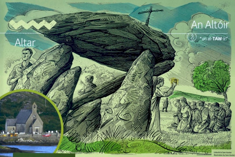 Another easily accessible site is Altar, at Toormore. This is a wedge tomb, probably over 4,000 years old and excavated in 1989. It remained in use through the Bronze Age and into the Iron Age. Dr. William O’Brien, in Iverni, says of this site: …over time this tomb came to be regarded as a sacred place, housing important ancestral remains in what was a type of community shrine. How fitting, then, that the flat capstone of the Altar wedge tomb became, in the Penal Days, a mass rock. And how intriguing to think of the continuation of this sacred space over the course of thousands of years.