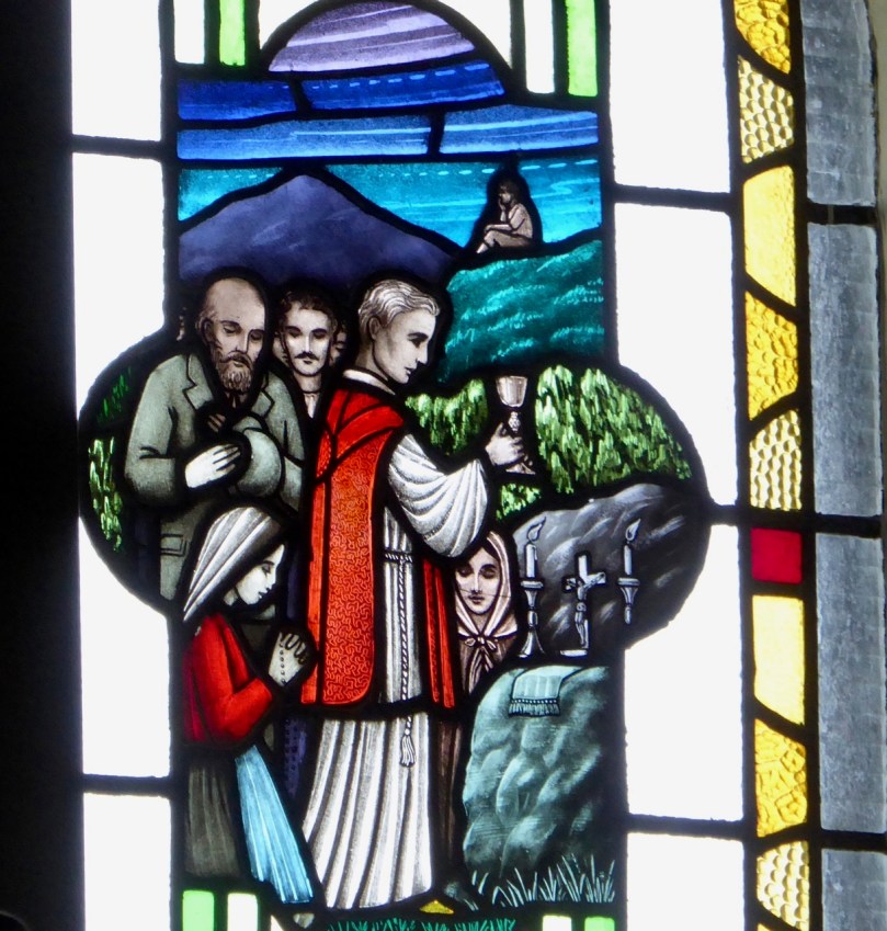 This stained glass window shows mass at a mass rock, with a lookout posted to keep an eye out for the redcoats