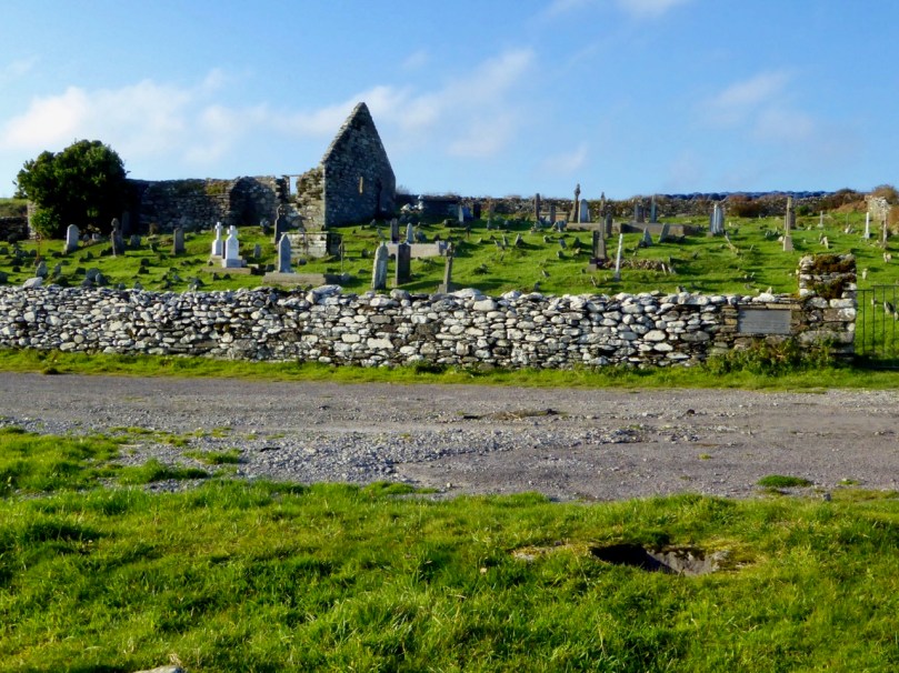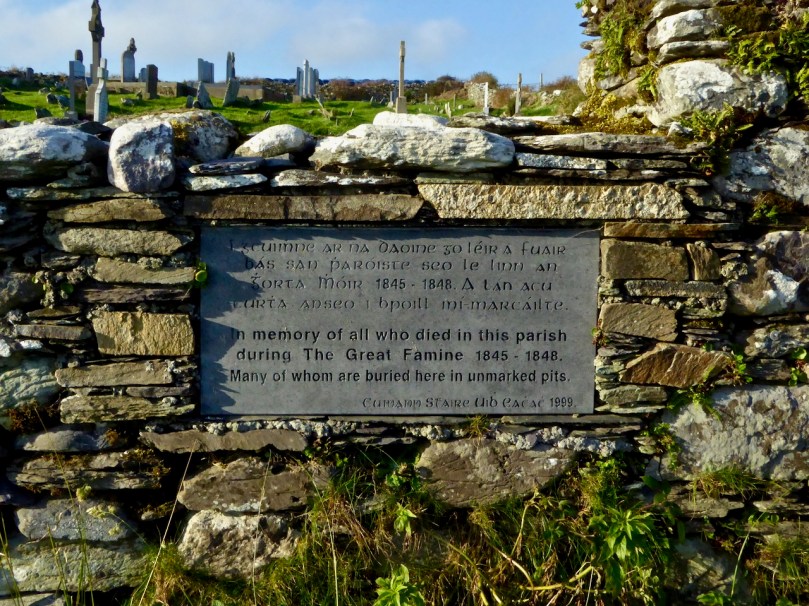The graveyard has headstones going back to the 1700s, although I couldn’t find any from that era on my searches. All the local names are represented here, including the Burchills and the Wilkinsons of my Cousins Find Each Other post. It was in use as a burial plot during the Famine – a memorial plaque on the wall attests to this.