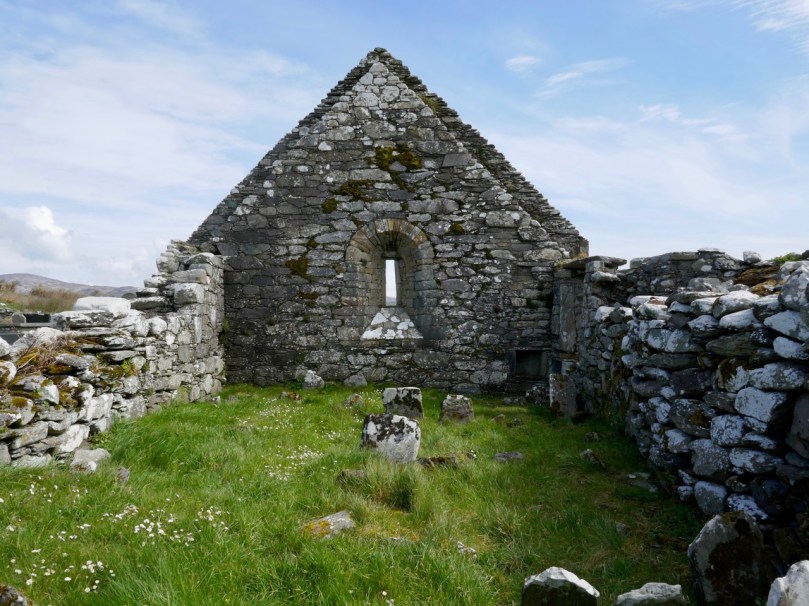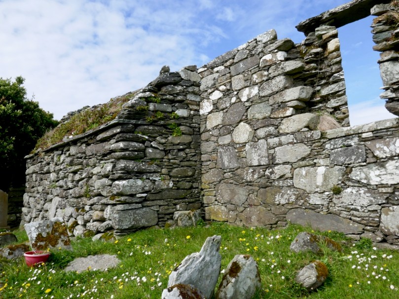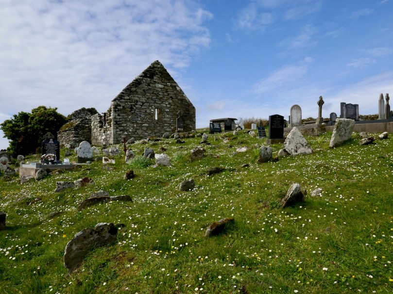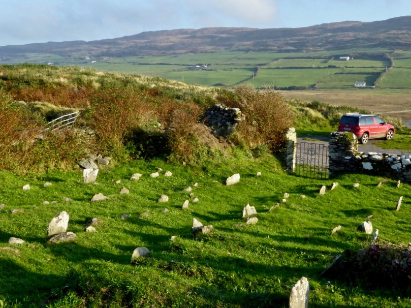The most visible reminder is the ruined church, surrounded by a graveyard. Once, these lands were in the possession of the Rev Fisher – remember him from my Saints and Soupers saga? They were associated with the Glebe Lands accruing to the Church of Ireland, which means that the rector was also the administrator of the graveyard, to whom you had to apply for permission for burial. The church and graveyard is known as Kilmoe (pronounced kill moo, meaning the the church of Muadh, although I haven’t been able to identify this saint), like the parish of the same name which occupies most of the Mizen west of Schull.