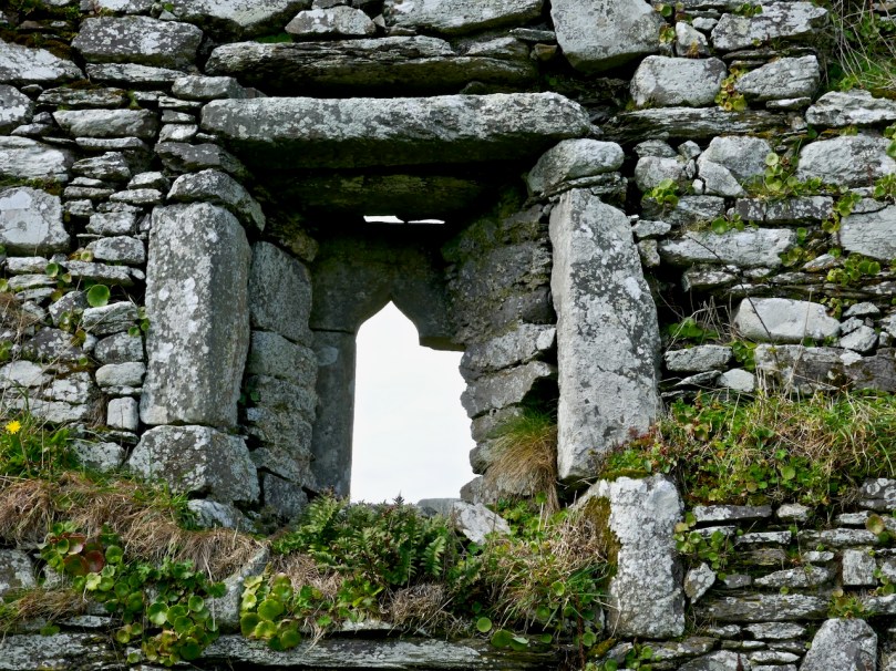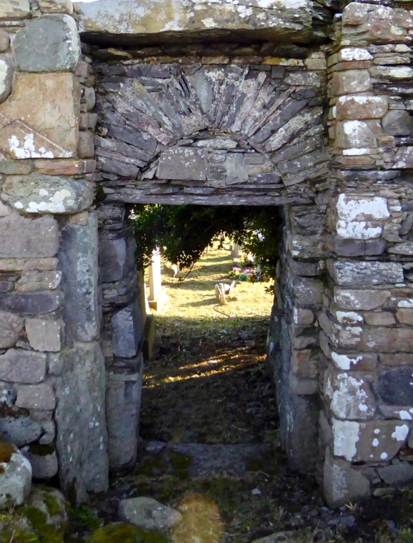 A feature of graveyards from this time was a watch-house, a reminder that bodysnatching was a lucrative trade. During the famine watch-houses also enabled people to be on the look out for dogs – there are accounts of dogs attempting to get at bodies barely covered by soil during this terrible time. There’s a ruined structure just inside the gate at Kilmoe (below), probably a watch-house from this time.