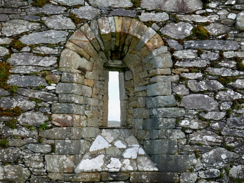 At the centre of the graveyard is a ruined church. It’s a very interesting structure to me, because I believe it is actually older than its normally-ascribed date. It was occupied, according to Brady’s Clerical and Parochial Records in 1581, when Dermot McCormack McCarthy was the rector and the church belonged to the College at Youghal and was dedicated to St Brendan. The Down Survey described it thus in 1700: Kilmoe : the church is ruinous, the walls that are standing are bad, built with stone and clay. The church stands about a mile from Crookhaven, to the westward near the head of Barlycove bay. 8A. of glebe on the north of the church; good land, set for £20 per an. There are the ruins of a vicaridge house joining to ye church-yard.”