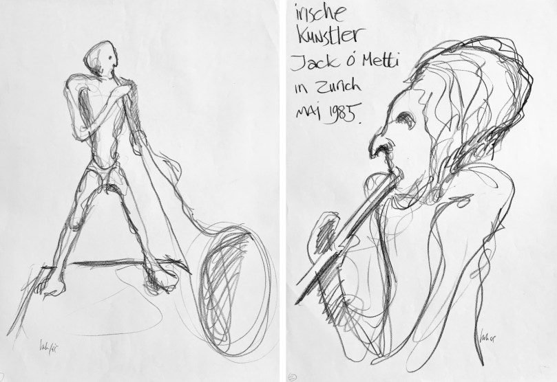 The artists took as their starting point one of the most important sculptors of the 20th Century, Alberto Giacometti, from Switzerland. He was famous for his ‘matchstick figures’: have a look at the book cover above. Ballydehob’s version of ‘Giacometti’ was built on a trailer – mainly by artists Ian Wright and Pat Connor – and he was playing an Alpenhorn. Brian Lalor made several sketches of the event (you can see him in the picture above, and one of his sketches above that): these sketches have lain dormant for 34 years and have not been shown anywhere until the Ballydehob exhibition, where they are being unveiled for the first time. Although a serious business, it was all a bit tongue-in-cheek. I think you can tell that by the name the artists gave their statue – Jack O’Metti! However, it was a tremendous success, and the crowds came flocking.