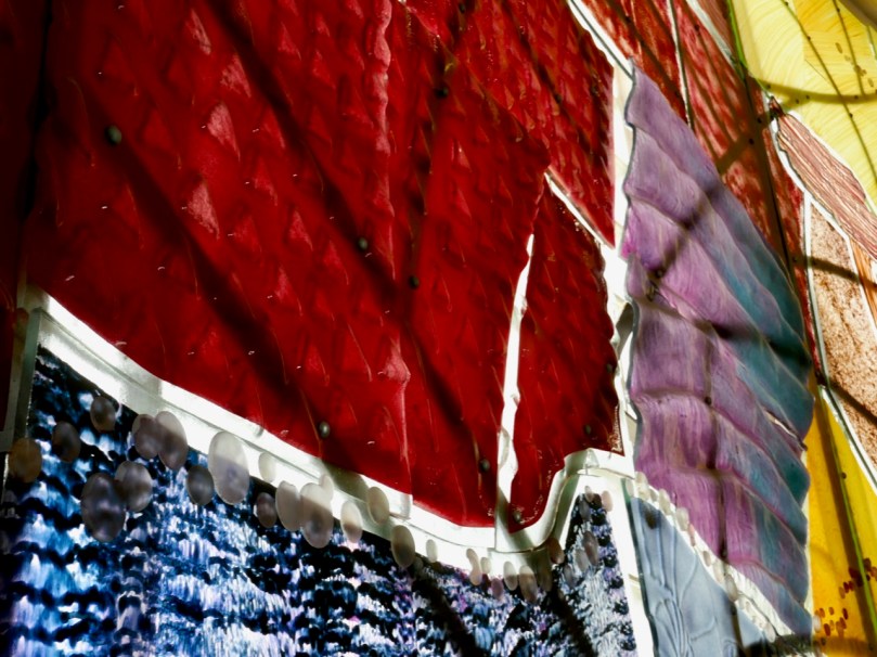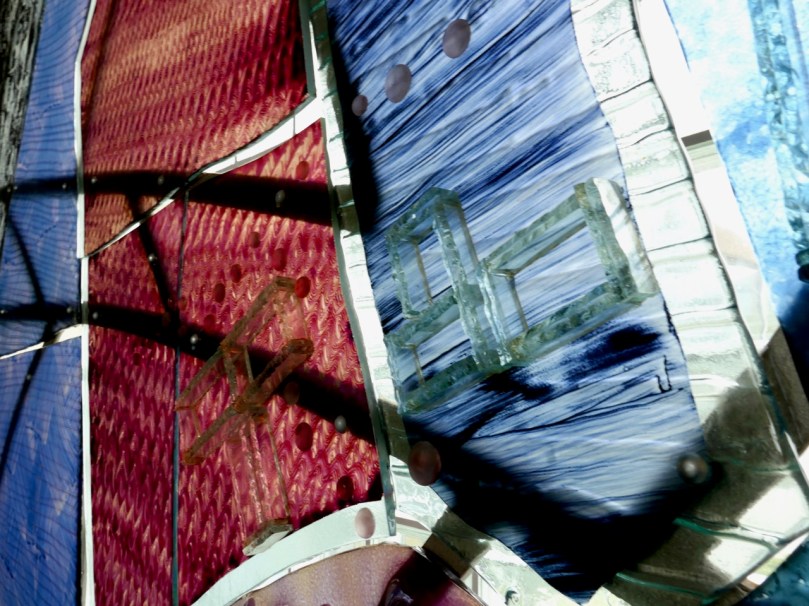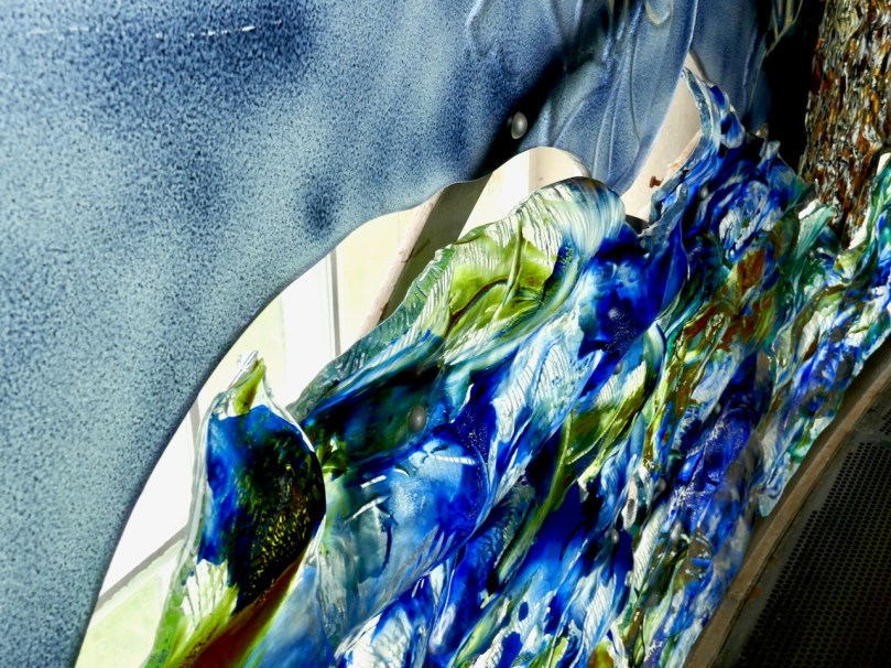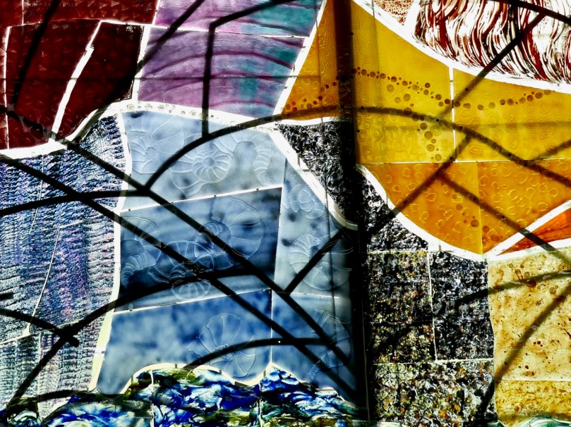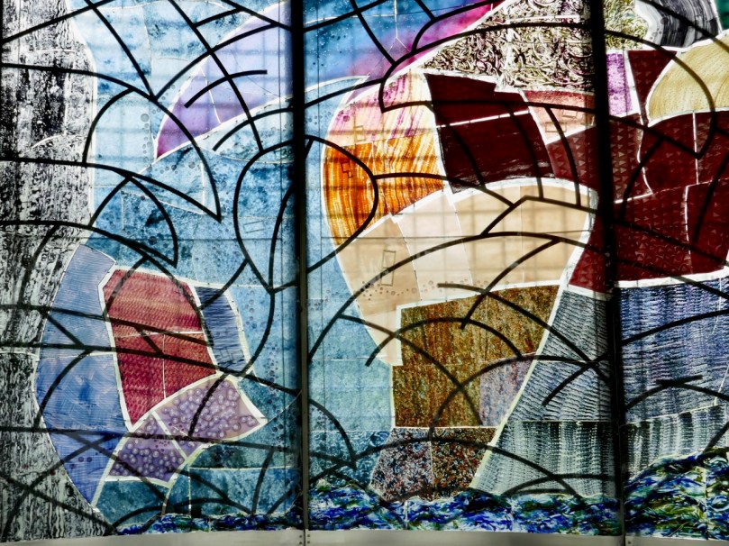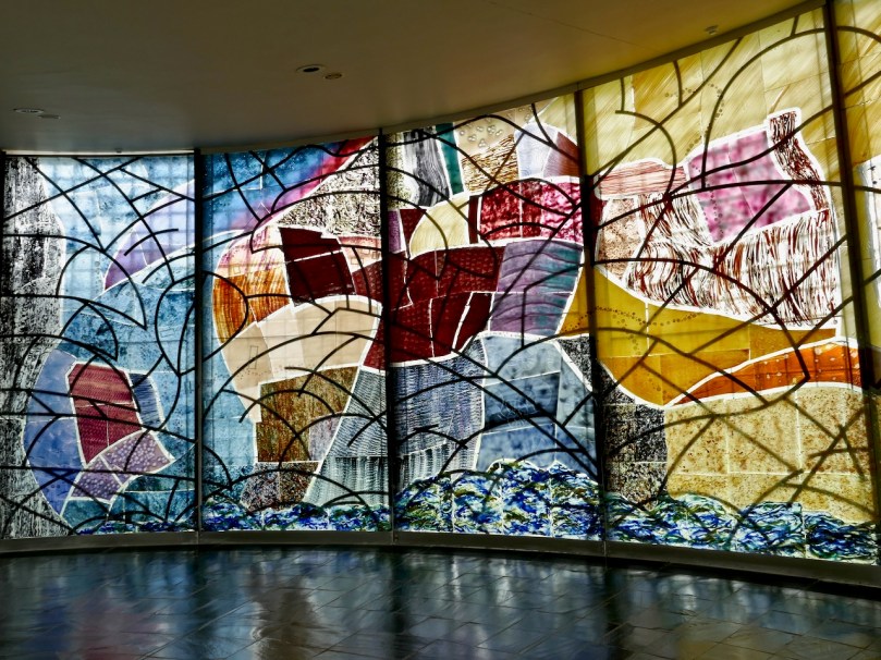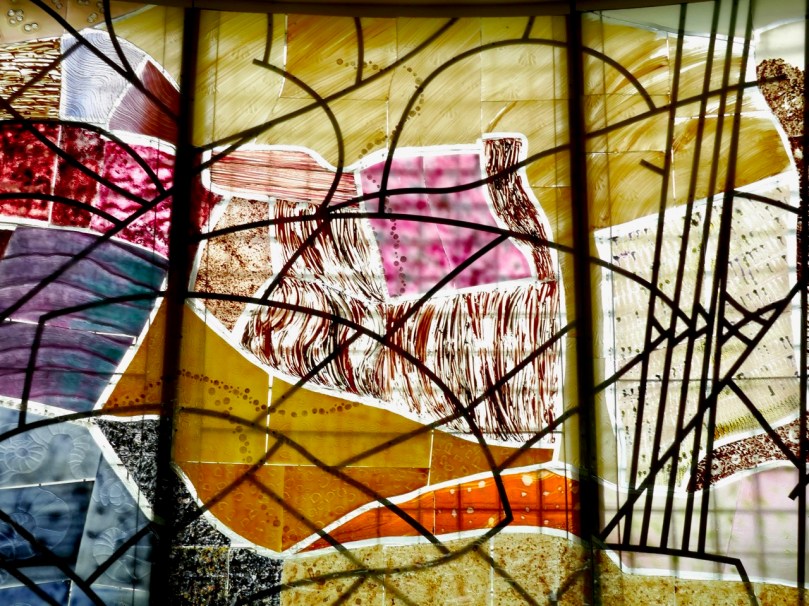This is not stained glass per se: a plaque explains the process: The panel is composed of over three hundred pieces of plate or window glass. They were each painted with enamel which was then baked into the surface. To complete the process, each piece was textured by melting it in a special kiln in a process known as ‘slumping’, Three and half tons of glass and three tons of steel have been used. It took almost a year to make.