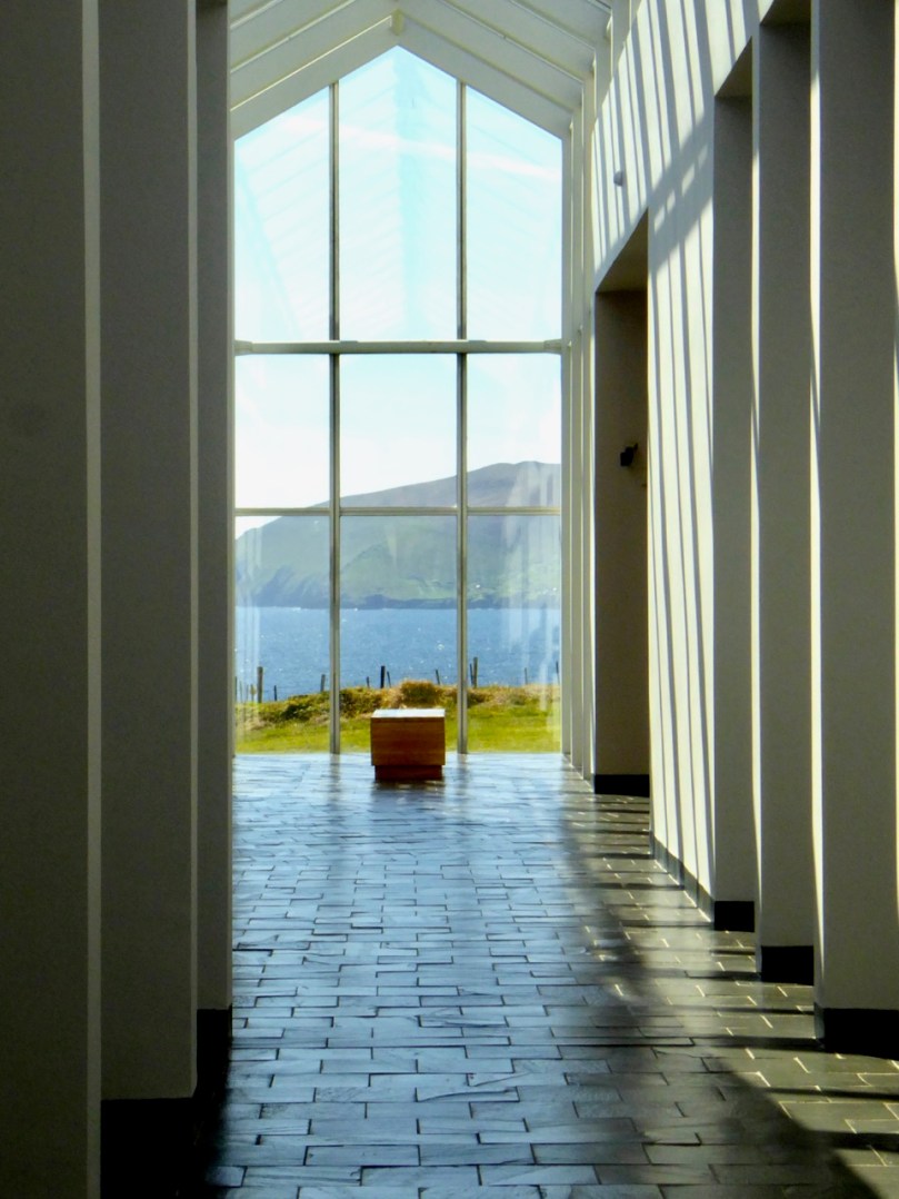 Funny how you see different things every time you visit special places. The last time we were at The Blasket Centre on the Dingle Peninsula, a couple of years ago, I immersed myself in the stories of the writers and the Island way of life, which is, after all, the focus of the exhibitions. Given that a visit to the Island itself can be difficult, calling for fine weather conditions, the exhibition is very well done and illustrates well the hardships and perils faced by Island people, as well as their depths of warmth, poetic language, stories and daily tasks. This time, I was equally struck by the building itself, and by the art at its core.