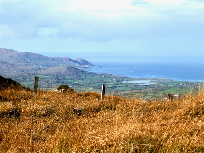 As we often do, we set out on a sparkling day last month to explore a part of the Mizen we aren’t familiar enough with yet. Our plan consisted of pouring over the OS Number 88 map and having an AHA! moment of realising that we haven’t been to a particular spot. This time, the dart landed on an area just northeast of Dunmanus Castle (seen above from Mount Gabriel), where it looked like there was a trail running along the water that would afford magnificent views of Dunmanus Bay and the Sheep’s Head. Things didn’t go quite as planned. . .