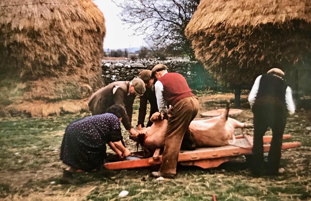 Another of Cresswell’s colour images, showing the killing of the pig – a family affair