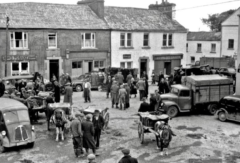 Header – Kinvara on Fair Day, 1955 by Robert Cresswell. Above – Kinvara, Co Galway, streetscape; compare these to Dorothea Lange’s views of Ennis and Tulla, Co Clare (in last week’s post), taken in the same period
