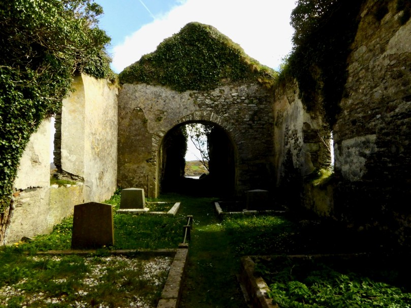 Surely one of the most picturesquely situated in Ireland, the early nineteenth century church at Aughadown on the Ilen is surrounded by a graveyard that tells the story of Irish and local history. Locals, by the way, use the pronunciation Affadown, and for the river, it’s Eye-len.