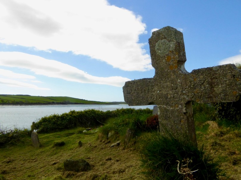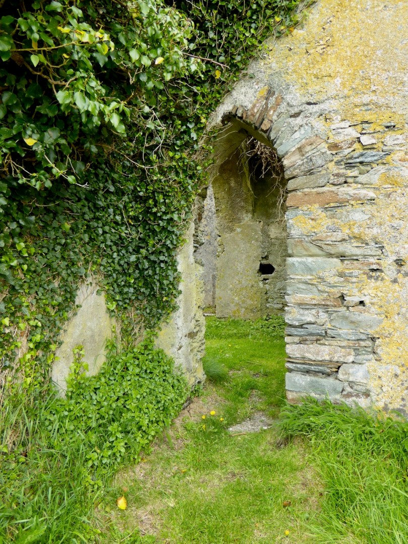 As the church fell into ruin it gradually accrued the ivy and the general air of dereliction that are the indispensable attributes of the romantic, greatly augmented by its charming siting on the banks of the Ilen river. Oxeye Daisies cover the graves in spring and summer, while Thrift flourishes along the banks. The outlines of the slate-hanging that would have kept the interior dry are still obvious on the outside walls – see the photo above.