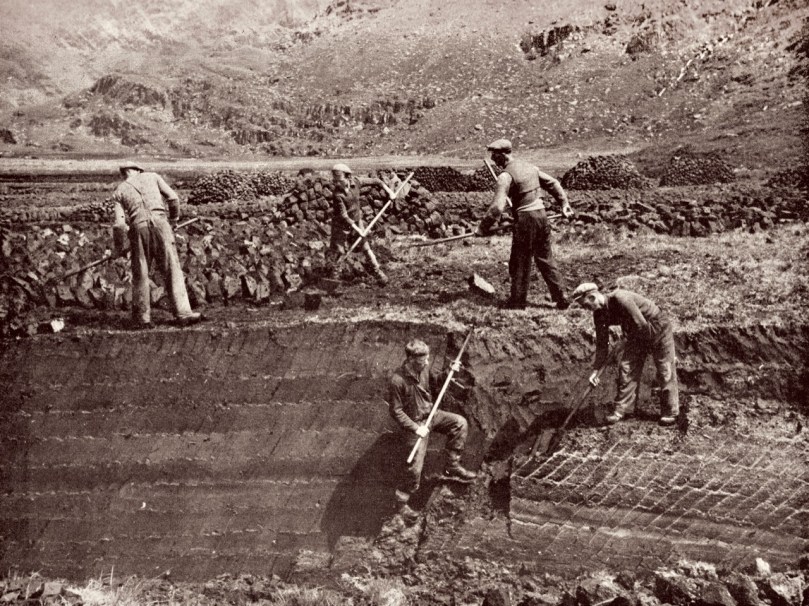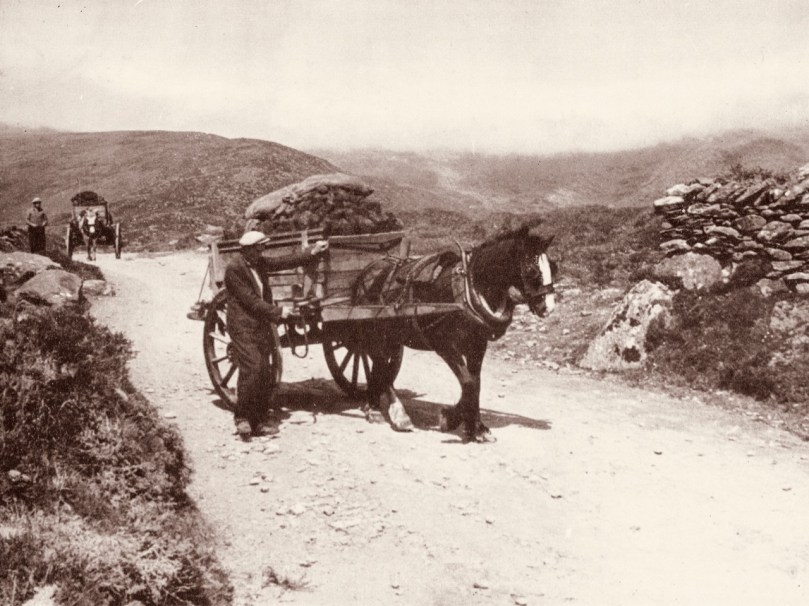 Tomás Ó Muircheartaigh (1907 – 1967) was an amateur photographer who recorded life in rural Ireland during the first half of the twentieth century. We have used examples of his work in previous posts. These two prints (above) demonstrate the hand-working of peat faces and the transporting of sods from the workings. Our Old Bog Road would have seen similar sights in its heyday.