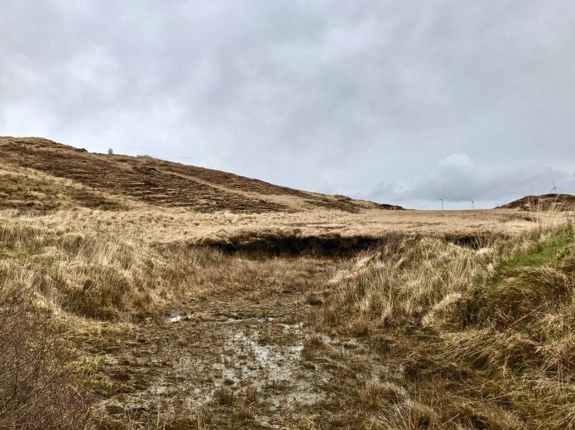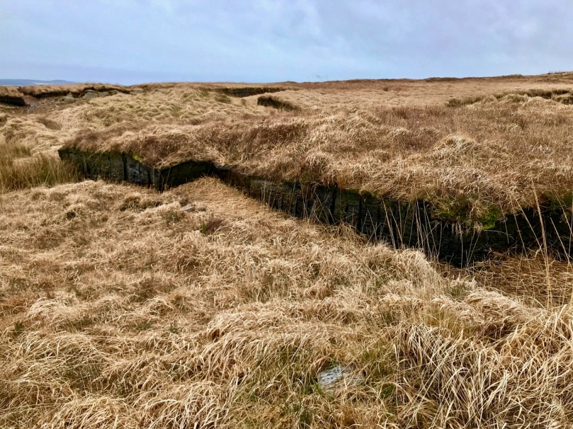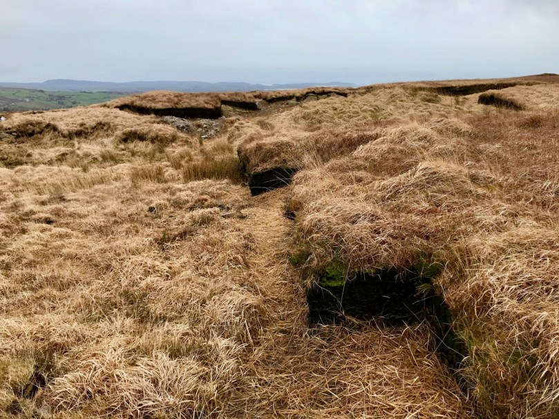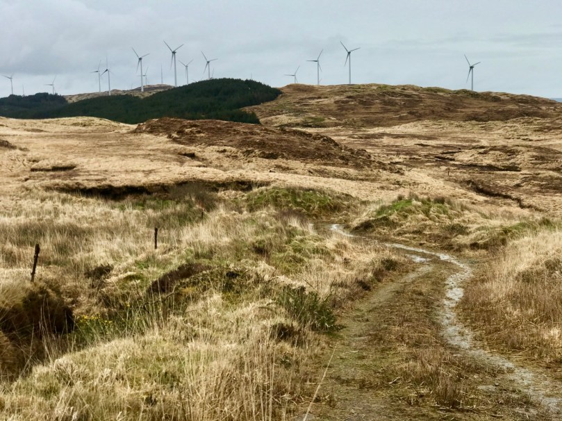 It was a sunless mid-March day when we set out: the wind was in the east and there was little colour in the landscape. There were, as yet, few signs of spring. We could see the ridge in the distance and, happily, the track appeared to climb towards it. In Ireland, the days of cutting peat for fuel are numbered: commercial operations will cease by 2025. Generations of families in rural areas have historically cut peat by hand and lay claims on the rights to do this. Increased regulation will eventually see this tradition declining along with all other fossil fuel production as carbon neutral ways to produce energy are developed. It seemed significant that the large array of 20 giant wind turbines on the high land to the east was a constant backdrop on our journey along the Old Bog Road.