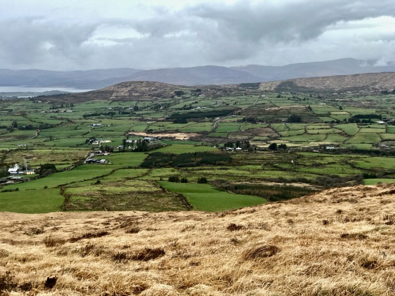 Although it wasn’t the best of days, the view to the north was exceptional, taking in Bantry Bay and the Beara mountains beyond. It’s a place that demands to be returned to. As we prepared for the descent we heard the sound of a small engine, and suddenly there was farmer Florence McCarthy arriving on a quad bike with two collies running behind: they were searching for lost sheep. Good chat was had – although, in deference to the Coronavirus crisis, we all kept the currently regulation distance apart. It felt very unnatural to not shake hands, and we forgot to ask for a photograph, until Florence was just disappearing over the brow of the hill!
