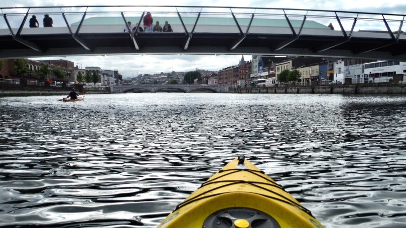 On this occasion, the trip was anti-clockwise. We launched at Crosse’s Green, right by the new half-built convention centre and under the looming walls of the 17th century Elizabeth Fort, and paddled downstream, passing first under the South Gate Bridge, the site of one of Cork’s original historic bridges, and from there down to the docks, past City Hall and the mid-century building where my father worked in the 60s. In the photo above the paddlers are passing the intersection of the South Mall and the Grand Parade.