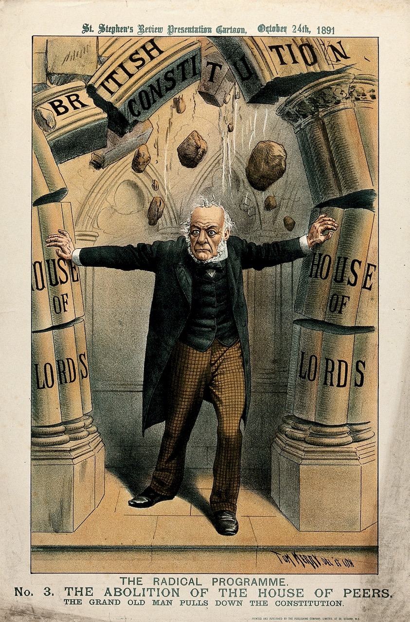 V0050358 Gladstone pushing pillars representing the House of Lords