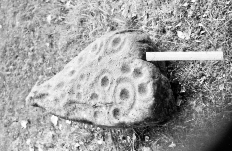 The drawing was done in 1972, while I was recording all the known examples of rock art in Cork and Kerry, travelling on a Honda 50 with with my equipment in a backpack. The sun shone every day that summer. Everywhere I went I was received with kindness and friendship, nowhere more so than at the big farm house owned by Tim and Clair Flynn. The stone was in their garden, having been found in a bog a short distance away and brought to the house in Tim’s grandfather’s time.