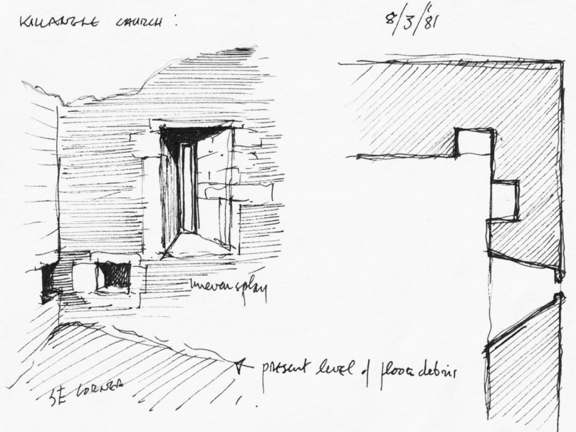 1. Finola, Great to read this piece on Killhangle and to see the use of my small ephemeral, done-on-the-trot, sketches from the 1980s. I was particularly struck by the photo and corresponding drawing of the aumbrey & window corner and how, while the photo records, the drawing records and simultaneously interprets; parallel forms of seeing, essential in the study of antiquities. If you will allow a digression, when I worked in classical archaeology in Jerusalem during the 1970s, I produced what were then regarded as highly controversial interpretative drawings of the site. Recently, a US- based academic has unearthed parallel archival drawings from 1868, done by pioneering Jerusalem excavators, roughly 100 years before — and coming to the same conclusions as I did. His small free sketches were just a few lines but capable of conveying a wealth of information in a squiggle. My point? The drawn line is a threatened species, but essential to the study of the past.