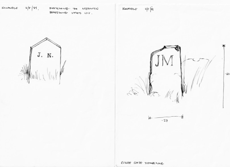 I am lucky to have Brian Lalor’s Sketchbook – quick records he made of his visits to  sites during field trips with the Mizen Historical and Archaeological Society in the 1980s. This kind of record is invaluable to show changes over time – the bullaun stone that Brian records in his sketch above can no longer be found.