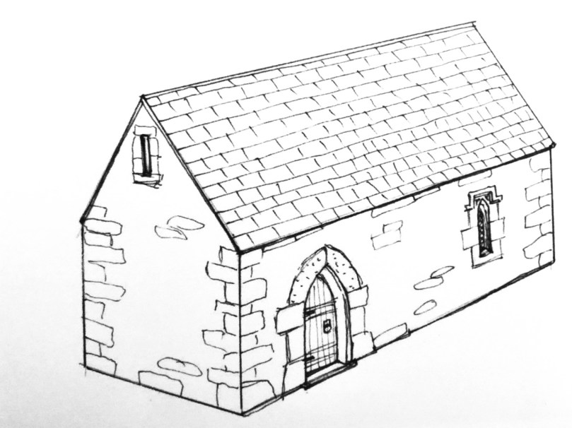 The church itself is in a ruinous state but enough remains to see some of typical attributes of a small parish church of this time, such as the one in the illustration (not by Brian) above. It’s a simple rectangular structure, oriented E-W, with the door in the south wall. Several small aumbreys (cupboards) are built into the south and east wall. There’s a window in the east wall which is missing almost all its dressed stone surround but we can surmise that it may have been ogee-headed.