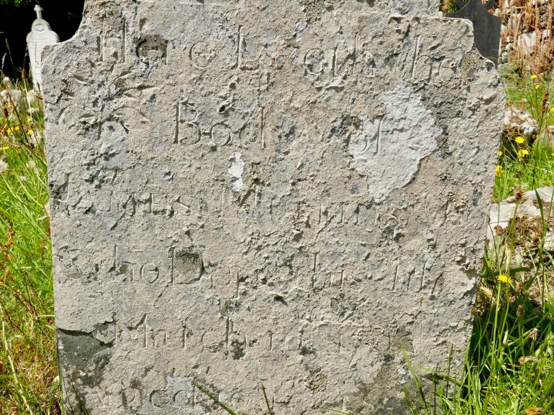 Inscribed headstones, for those who could afford them, did not become commonplace until the 18th century. Headstones dating to the 1700s are actually fairly unusual in West Cork so when Brian deciphered one in Killhangle, he recorded it (not an easy task – see how much lichen covers the surface now) and wrote up his findings for the Mizen Journal.