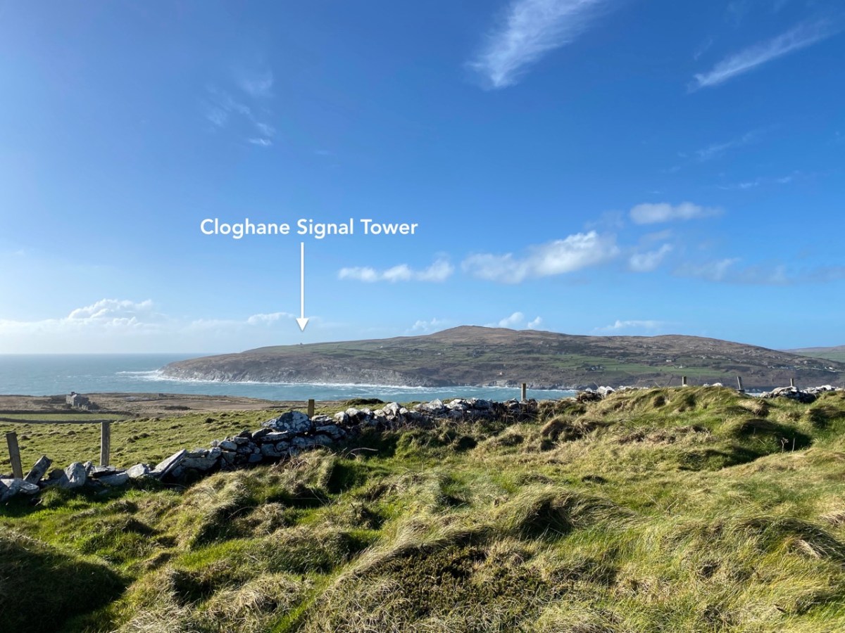 Above – views north-west across to Cloghane, Mizen Head, from Brow Head. The lower photo is taken with a long lens. Cloghane is 3.8km away from Brow Head: it doesn’t sound very far but, as you can see from the centre picture here, it’s remarkable that telescopes were good enough, in the early 19th century, to make out visual signals in any great detail. Weather conditions were obviously an important factor in this. Below, the tower at Knock, Lowertown, near Schull, is some 19km away to the east. When we visited the vestigial Ballyroon signal tower, on the Sheep’s Head to the north, we could also clearly see across to Brow Head – a distance of about 17km.