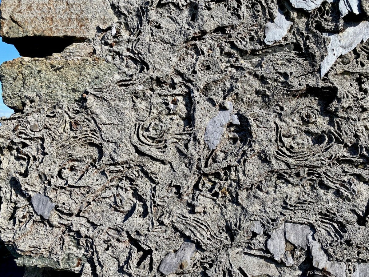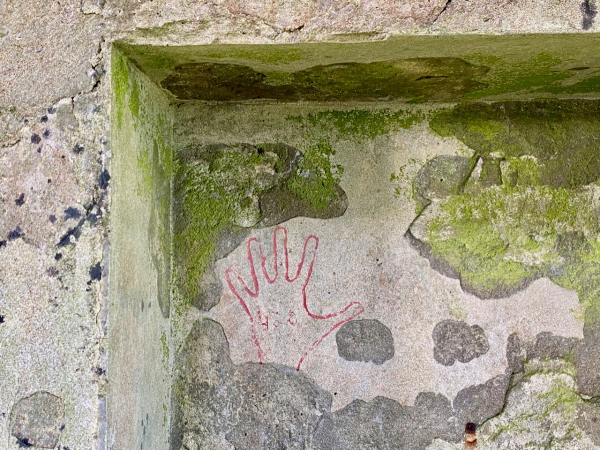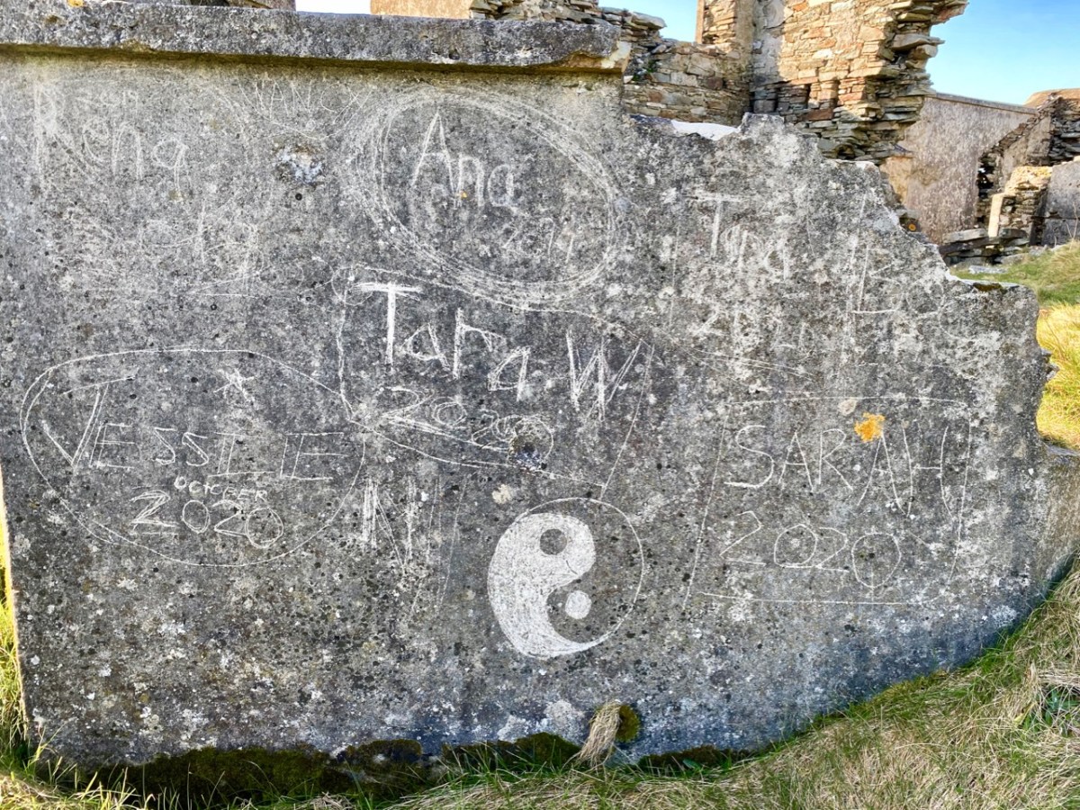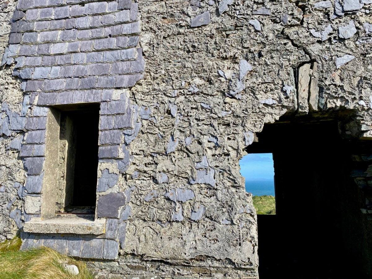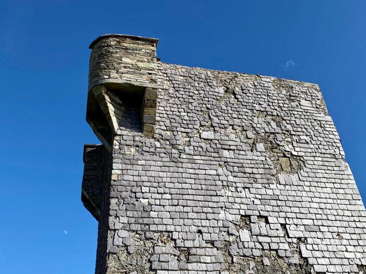 So far we haven’t said much about the 1804 signal tower itself. Although ruined, it is a good example, reasonably stable, and has survived two centuries of severe Atlantic gales remarkably well. All the elements are recognisable: projecting bartizans, slate hung external walls for improved weatherproofing, an intact roof and distinct internal features – and a little enigmatic graffitti. Compare all these with the other towers in our series so far (there are links at the end).