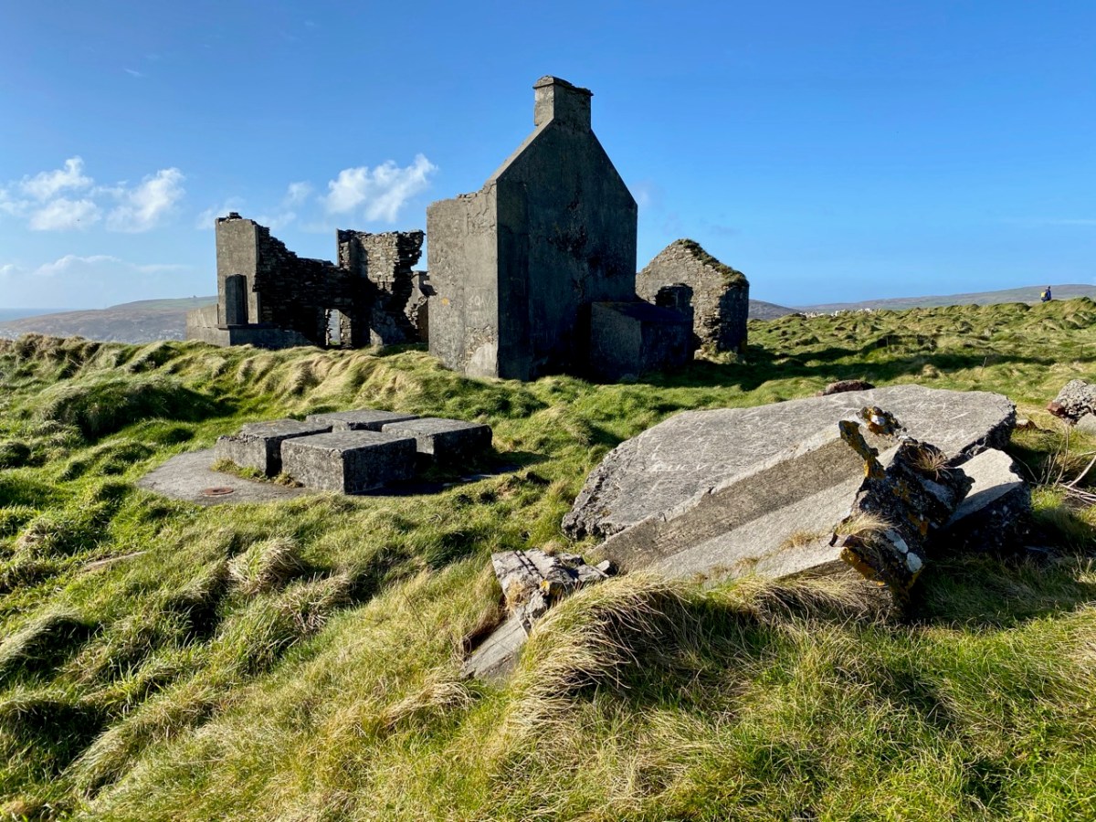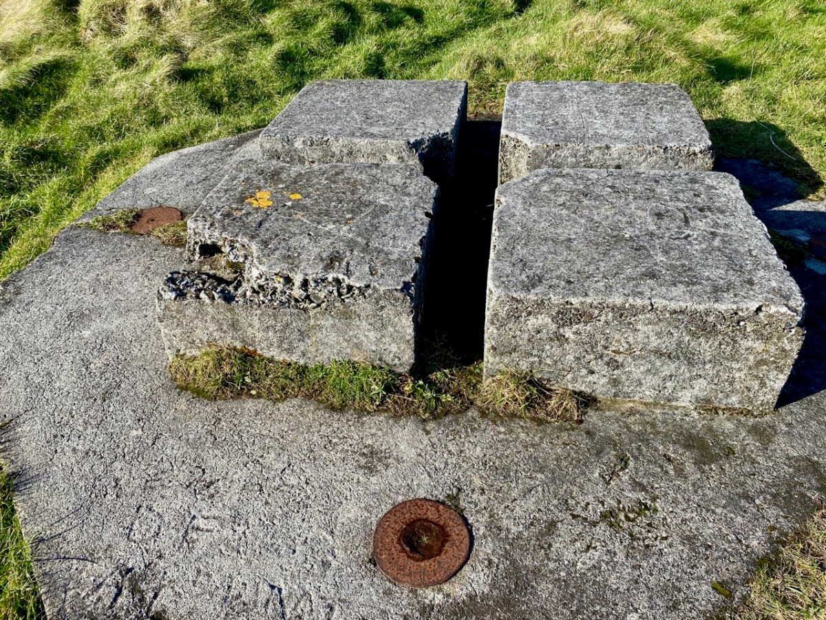 For this excellent drone picture of the Brow Head site, taken in 2017, I am most indebted to Jennifer & James Hamilton, mvdirona.com. Jennifer and James are intrepid adventurers, travelling around the world on their Nordhavn52 vessel. It’s well worth going to their website to see what they get up to: it makes our own travels in the West of Ireland seem a little humdrum… On the right of the photo is the 1804 signal tower; on the left is the Marconi station with – just in front of it – all that is left of the 1939-45 lookout post. On the right in the foreground is the generating station shown in the present day photo, below. Note, also, in all these images can be seen the four-block supporting base for the Marconi transmission mast.